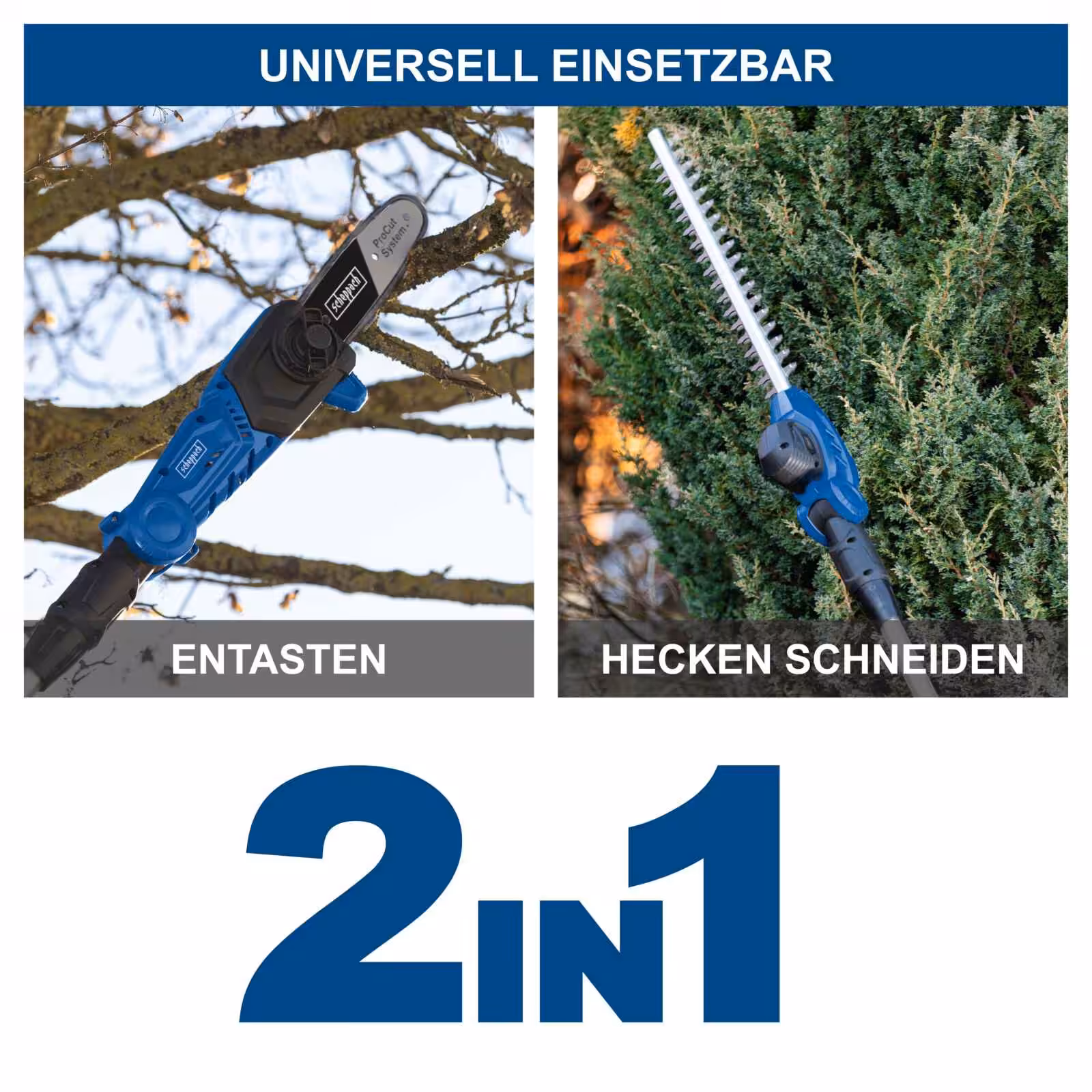 Scheppach 2in1 juhtmeta multifunktsionaalse seadmega C-PHTS410-X saab kõrgemaid oksi või kõrgeid hekke lihtsalt maast pügada.